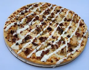 Ranch Sauce Base, Mozzarella Cheese, Grilled Chicken and Bacon. Finished with a ranch drizzle.
