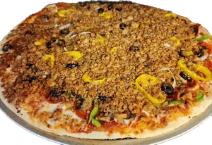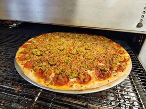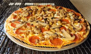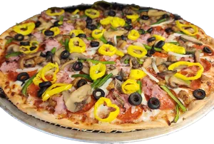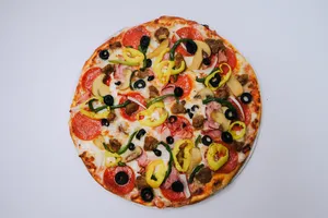 Pizza sauce, mozzarella cheese, crumbled pork sausage, pepperoni, banana peppers, green peppers, mushroom, black olives, onions
