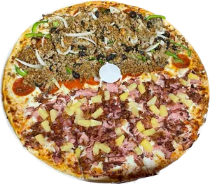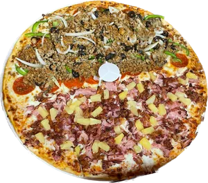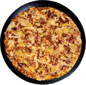 Pizza sauce, mozzarella cheese, ham, pineapple, bacon bits, topped with a brown sugar sprinkle