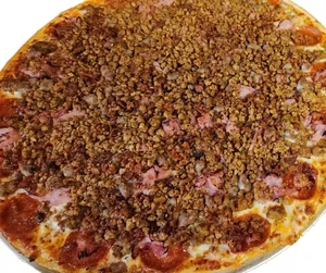 Pizza sauce, mozzarella cheese, Italian sausage, beef, pepperoni, ham, bacon, crumbled pork sausage
