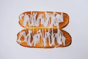 Buttered and coated with cinnamon and sugar, finished with an icing drizzle.
