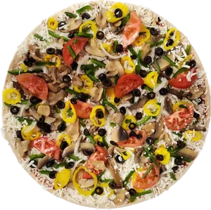 Pizza sauce, mozzarella cheese, mushroom, onions, green peppers, black olives, banana pepper rings, sliced tomatoes